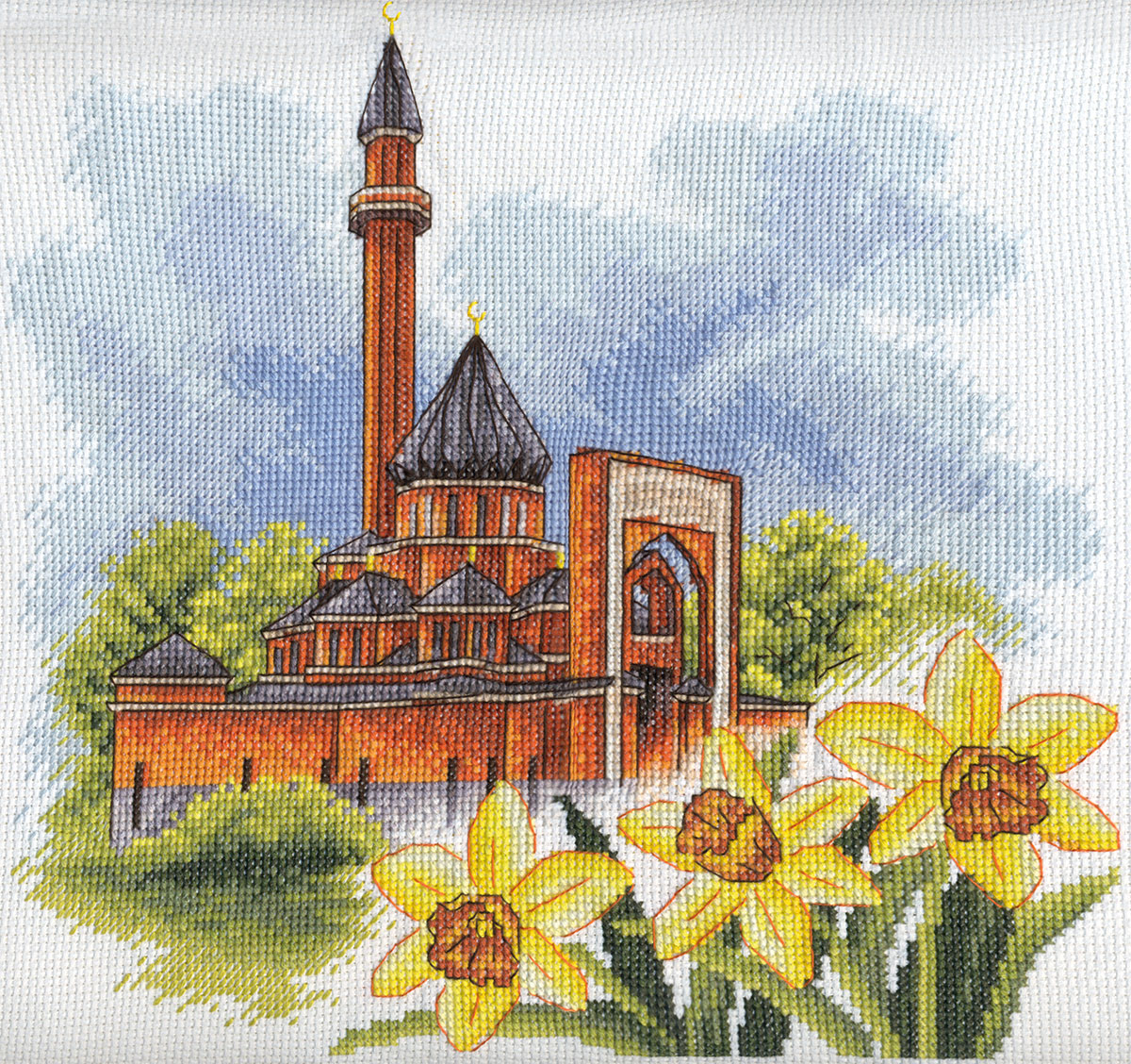 Embroidery design is based on the image of the principal mosque of Kazan in the Republic of Tatarstan. Having a great historical significance for the Tatar culture, the Kul-Sharif mosque is an important national symbol and stands for the revival of the Republic of Tatarstan sovereignty.
